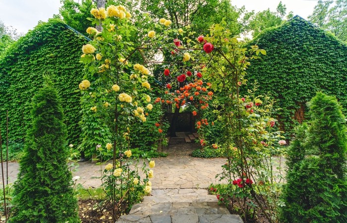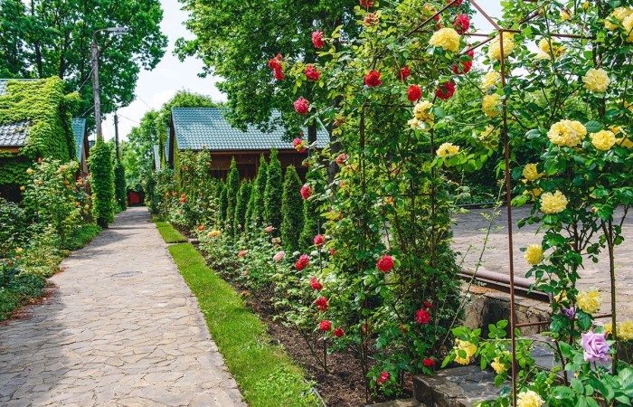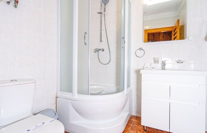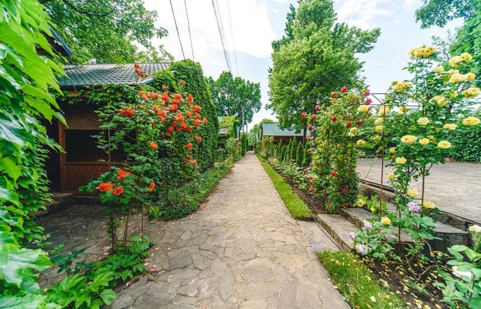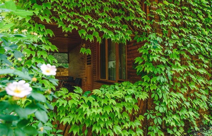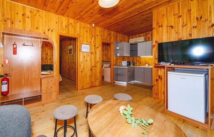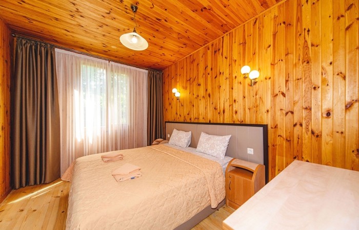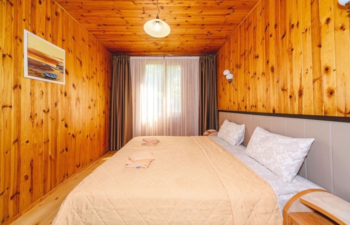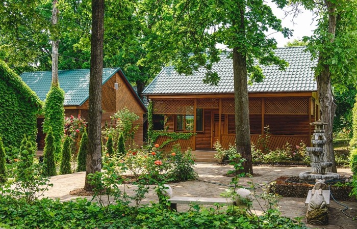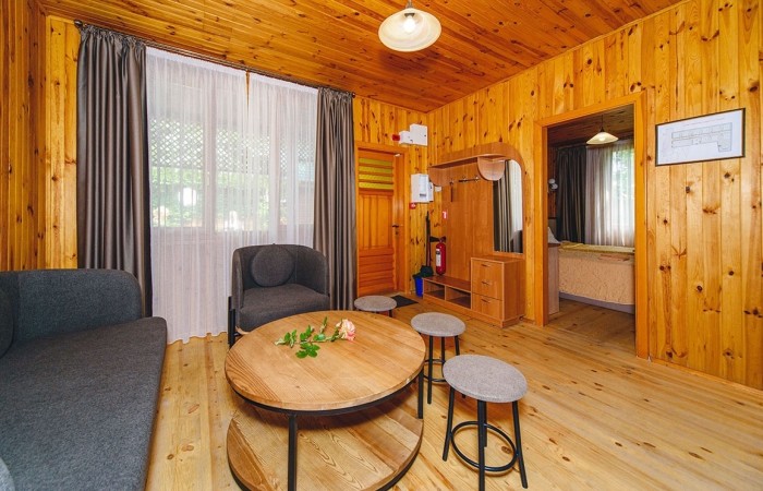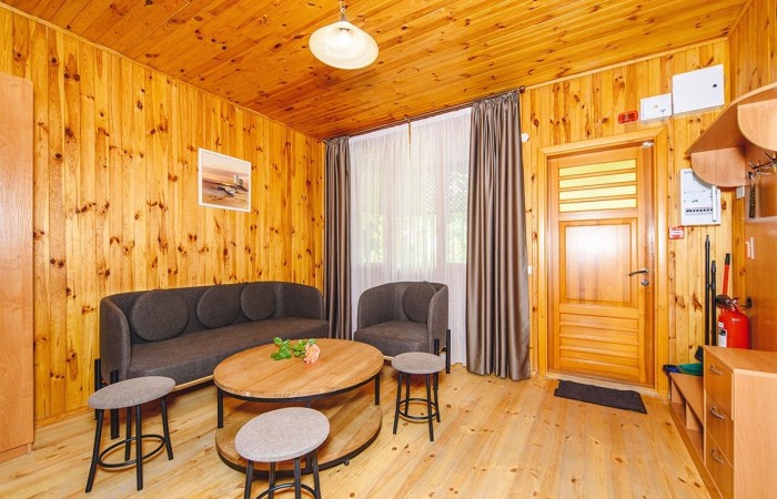 An eco-cottage is a one-stored wooden house surrounded by greenery and flowers. The cottage has three rooms suitable for a family or small company. The cottage's exterior and interior are wooden, creating an atmosphere of comfort and warmth. The cottage has a summer terrace with furniture, where you can relax on a hot day, enjoying peace and tranquility. An additional cot can be provided for a small child.