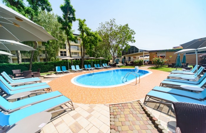 Вокруг малого бассейна много зелени, многолетних деревьев и цветов, что создает прохладу для отдыха в жаркие дни лета.
