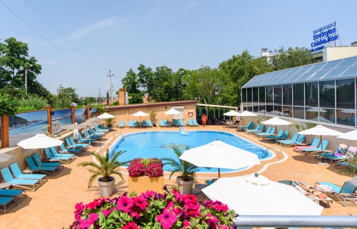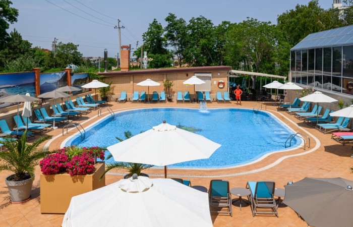 Зона релакса возле бассейнов под открытым небом на территории пансионата включает в себя два взрослых бассейна , гриль бар «Лето» , лаунж-зону с тремя удобными для отдыха ракушками, рассчитаными для отдыха семьей, душ с пресной водой и туалеты.