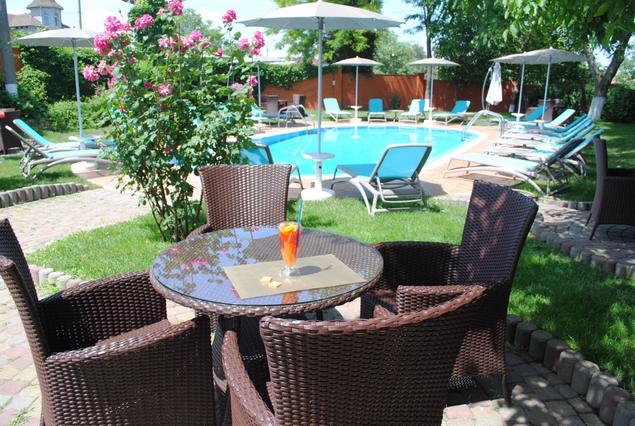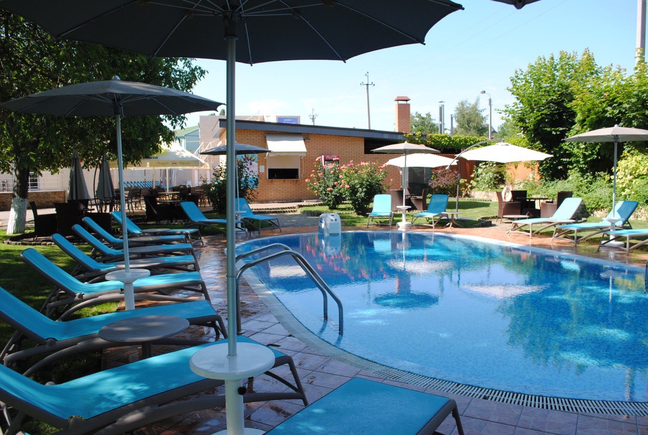 The lounge area near the outdoor pools includes two swimming pools, a grill bar "Leto", three comfortable shells for family’s chilling out, a freshwater shower, and toilets.
