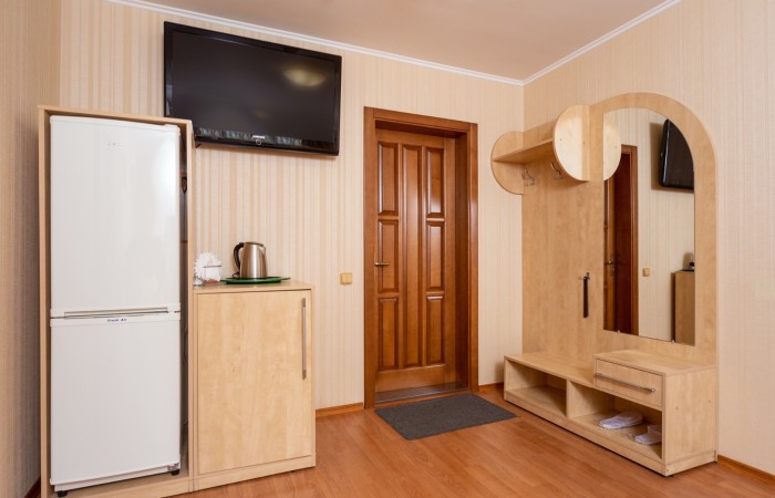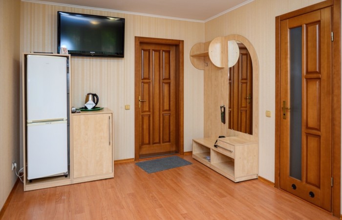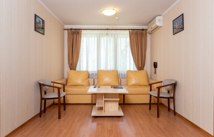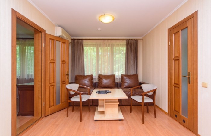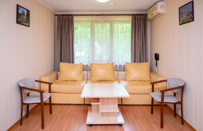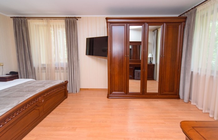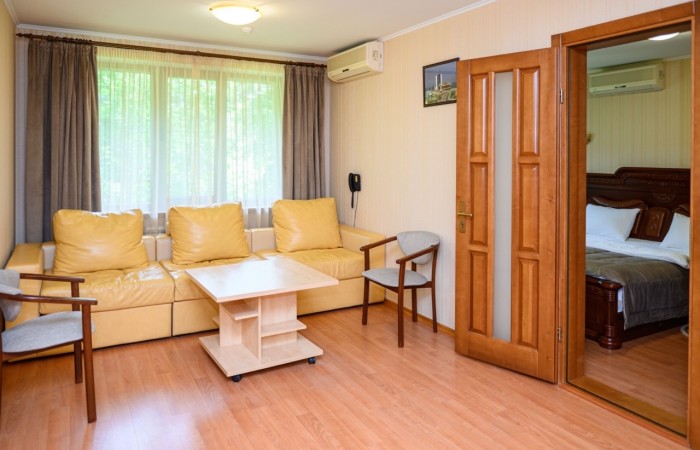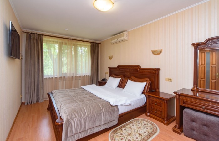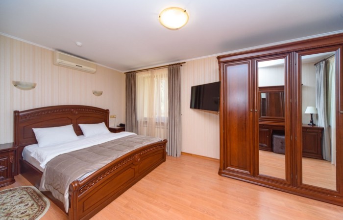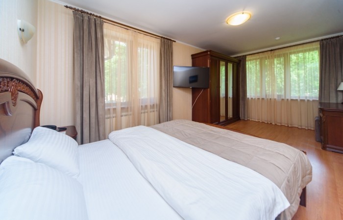 Двокімнатні номери «Люкс» мають просторе планування та класичний інтер'єр. Номери підходять для поціновувачів комфортного відпочинку та елегантності. Витонченість інтер'єру дозволить вам розслабитися та повноцінно відпочити.