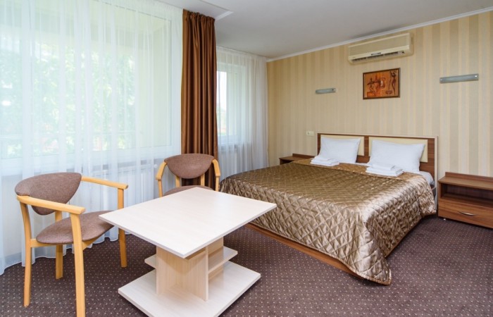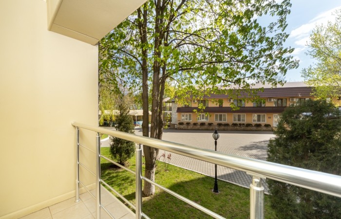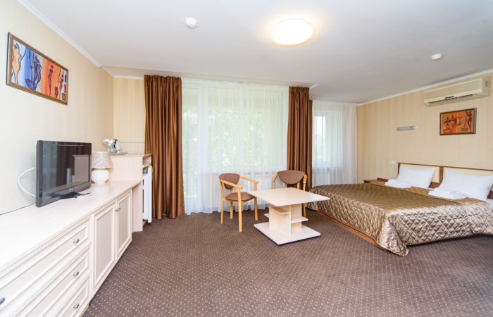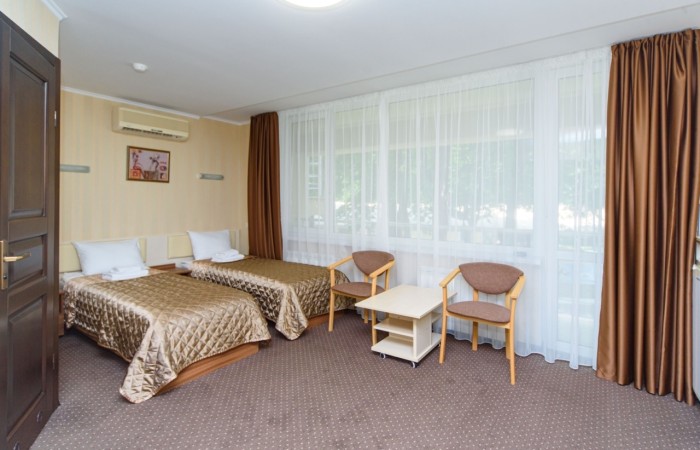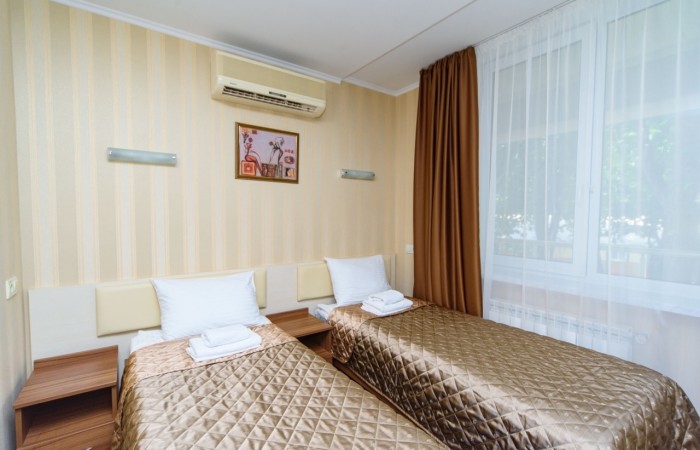 В номері передбачено два односпальних ліжка або двоспальне ліжко*. Є можливість встановлення додаткового ліжка. В усіх номерах простора лоджія з видом на літні басейни або внутрішній двір пансіонату.